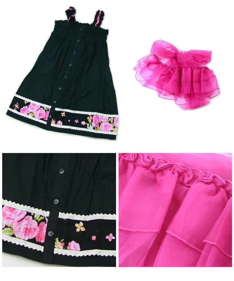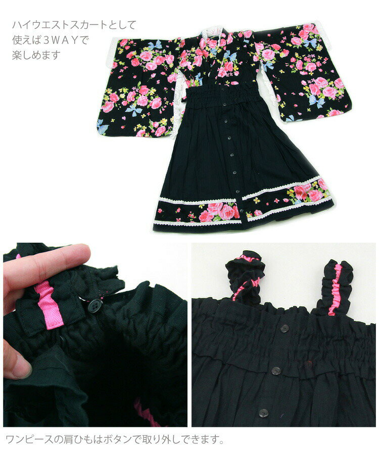 浴衣 セット 子供 キッズドレス 帯 浴衣セット 浴衣ドレス セパレート ワンピース スカート ゆかた 女の子 キッズ ガール キッズ浴衣 かわいい 簡単 兵児帯 へこ帯 100 110 120 販売 購入 綿 フリル レース 黒 ブラック 薔薇