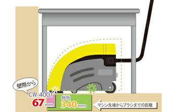 タイルカーペットフロアをパワフルに清掃! ■壁際最接近67mmを実現!(他社340mm) 壁際67mmまで清掃が可能です。