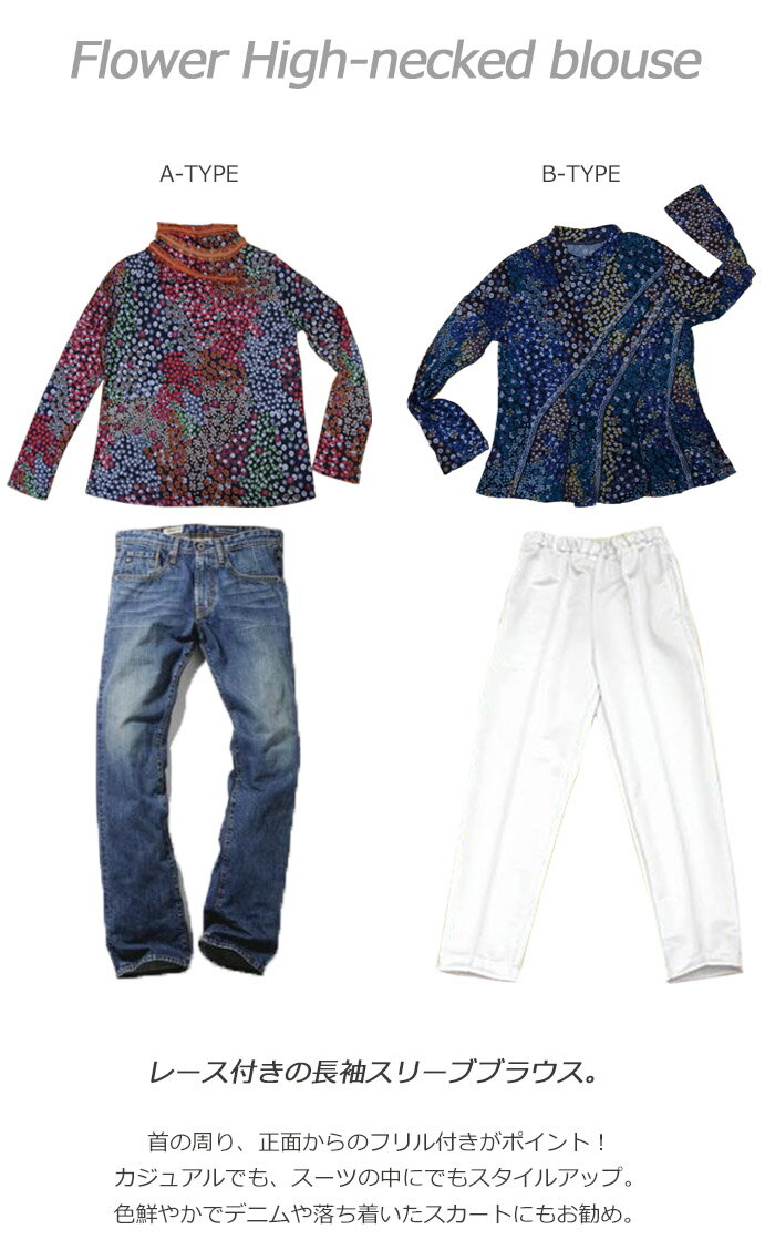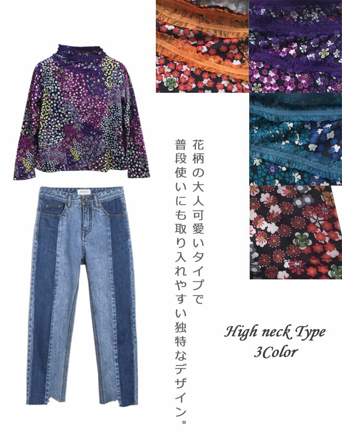 【DM便送料無料】2type 4カラー ハイネック カットソー 花柄ブラウス 長袖 タートルネック 薄手ハイネック レディース トップス 肌触り柔らか インナー シャツ UV ファッション 重ね着 春 秋